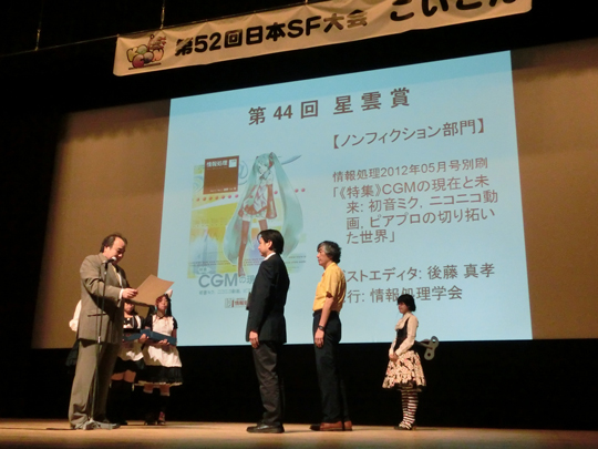 情報処理2012年05月号別刷「《特集》CGMの現在と未来: 初音ミク, ニコニコ動画, ピアプロの切り拓いた世界」が第44回星雲賞<ノンフィクション部門>を受賞しました。2013年7月20日(土)第52回日本SF大会こいこん(会場:広島県広島市 アステールプラザ)の中で星雲賞授与式が行われ、情報処理学会と後藤真孝氏(本特集ゲストエディタ)が受賞しました。本学会代表として中島秀之編集長が、ゲストエディタとして後藤真孝氏が受賞挨拶をしました。