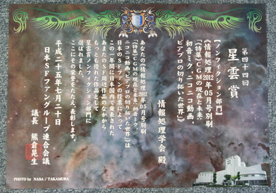 情報処理2012年05月号別刷「《特集》CGMの現在と未来: 初音ミク, ニコニコ動画, ピアプロの 切り拓いた世界」が星雲賞受賞