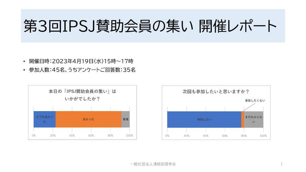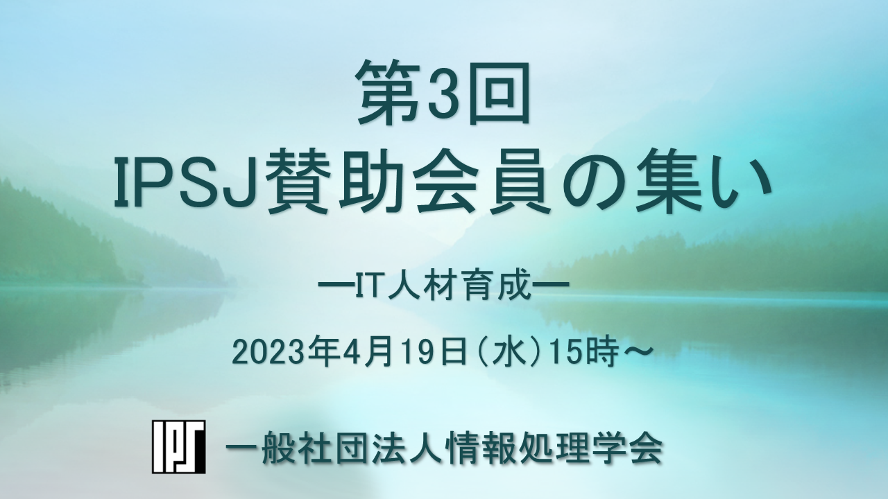 第3回IPSJ賛助会員の集いを開催いたします。今回のテーマは「IT人材育成」です。 参加者は正会員、学生会員にも拡大して募集いたします。 全国大会のインダストリアルセッションに参加できなかった方にもお勧めいたします。 先端技術や事業・サービスのご紹介などをご講演いただける賛助会員様からのご連絡をお待ちしておりますので、ぜひよろしくお願いいたします。